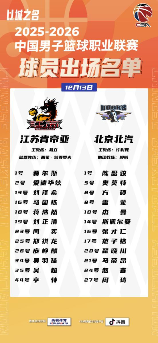 12月13日,北京北汽队迎来了本队2025至2026赛季CBA联赛的首场比赛。北汽队在客场以84比74战胜江苏肯帝亚队,整场比赛过程比较顺利,全队12人出场10人有得分。